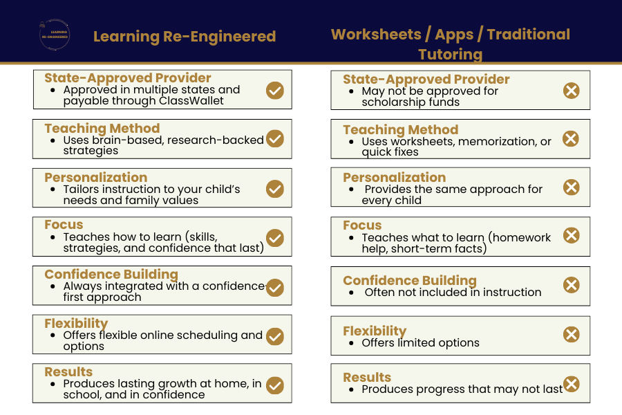 If you live in a state with an ESA or scholarship program, your child's tutoring may already be fully covered. Learning Re-Engineered is an approved provider in multiple states, which means you can use your funds for research-backed reading and writing support paid directly through ClassWallet with no out-of-pocket stress.