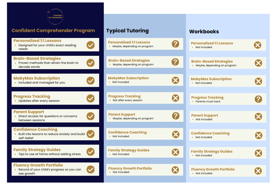 Other options might give your child practice, but they rarely provide the full picture. Here's how the Confident Comprehension Program compares: