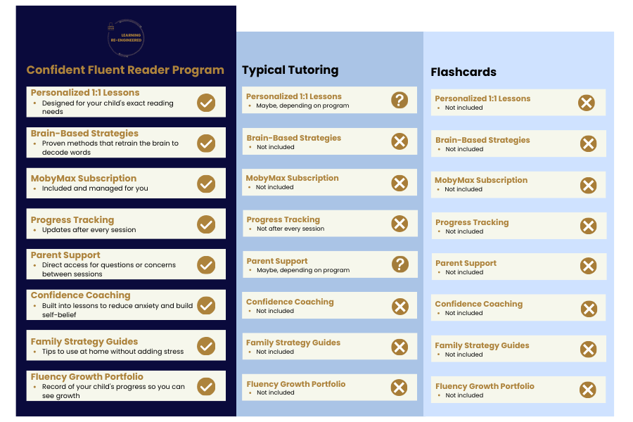 Pricing depends on your child’s needs, so the exact plan is shared after the complimentary assessment. What I can tell you is this: families often spend more piecing together tutors, apps, and extras and still don’t see lasting results. With this program, everything your child needs for reading fluency is included in one place.